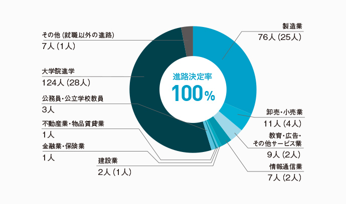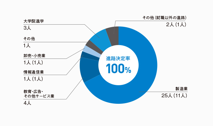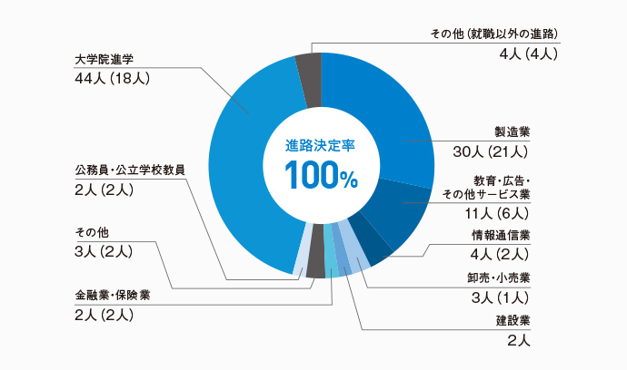 就職先としては製造業が中心で、約4割の学部生が大学院へ進学します。