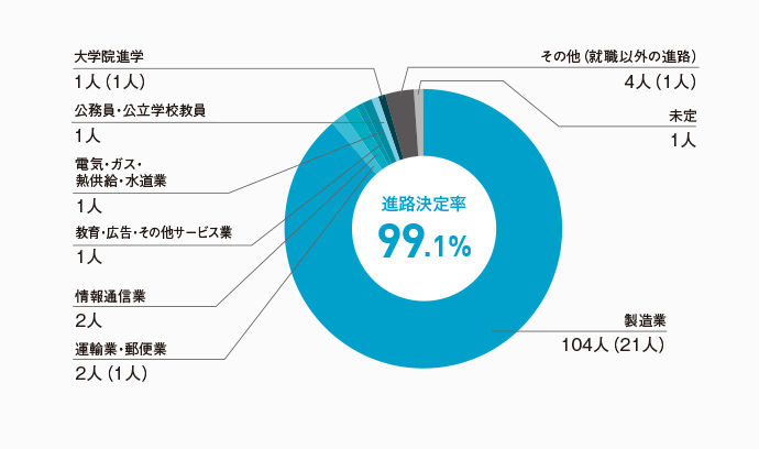 本学科の進路決定率は、学部生で100%、大学院生で99.1%となっています。主な就職先としては製造業で、その中でも特に化学系や金属・セラミック系、機械系に多くの学生が就職しており、2023年度以降も、「ものづくり」の基礎を支える企業への就職は高水準が期待できそうです。さらに、本学科の特徴として学部生の51.5%(124名)が大学院に進学しており、多様な「ものづくり」に関する専門的な知識・技術を身に付けたのち、その90%近くが製造業に就職していることが挙げられます。