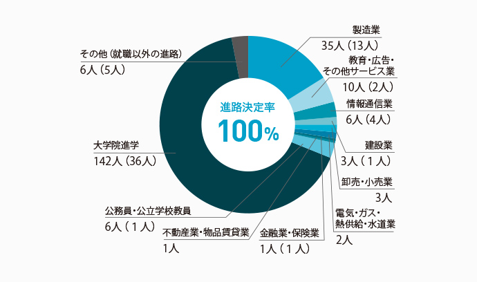 就職先としては製造業が中心で、約4割の学部生が大学院へ進学します。