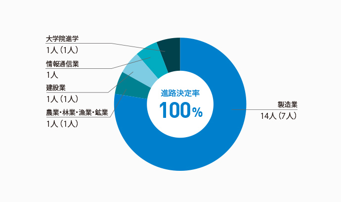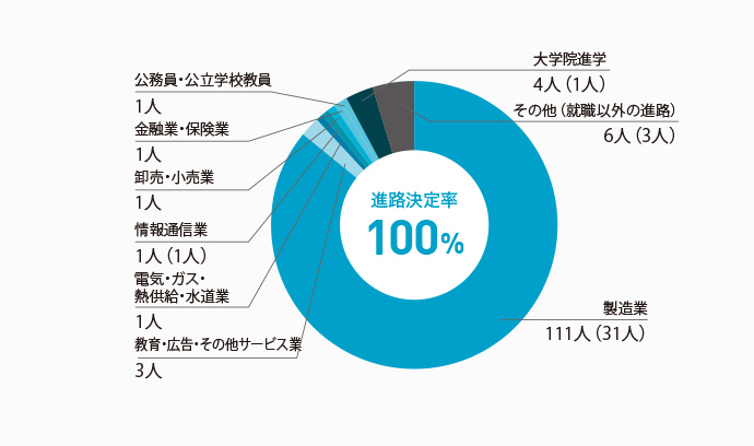 本学科の進路決定率は、学部生・大学院生ともに100%となっています。 主な就職先としては製造業で、その中でも特に化学系や金属・セラミック系、機械系に多くの学生が就職しており、2024年度以降も、「ものづくり」 の基礎を支える企業への就職は高水準が期待できそうです。さらに、本学科の特徴として学部生の66.0%(142名)が大学院に進学しており、多様な「ものづくり」に関する専門的な知識・技術を身に付けたのち、その90%近くが製造業に就職していることが挙げられます。
