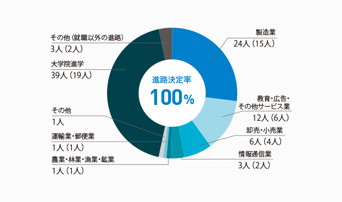本学科の進路決定率は、学部生・大学院生ともに100%となっています。その多くが製造業を中心に就職しており、中でも特に食品、医薬・化学系の企業への就職が多いことが本学科の特徴です。 学部生では、製造業の他に、教育・広告・その他のサービス業、卸売・小売業に就く学生もいます。また、2023年度は39名(43.3%)が進学しており、より深く専門知識や技術を学んだのち、「ものづくり」を支える高度な技術者や研究者をめざすことになります。