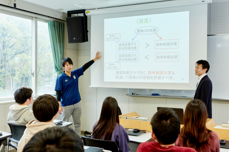 本演習では、まず専門書を輪読して、ビジネスの現場で見られる企業の戦略的行動を経済学の観点から分析する方法を修得します。また、データを用いて経済現象を実証分析する方法を学び、研究に必要な基礎力を身に付けます。次に、4~5人に分かれてグループ研究に取り組みます。研究成果は、経商合同学内ゼミナール大会をはじめ、他大学とのインターゼミナール大会(これまで関西学院大学、神戸大学、学習院大学のゼミと実施)で発表し、他ゼミの学生と研究成果について議論します。