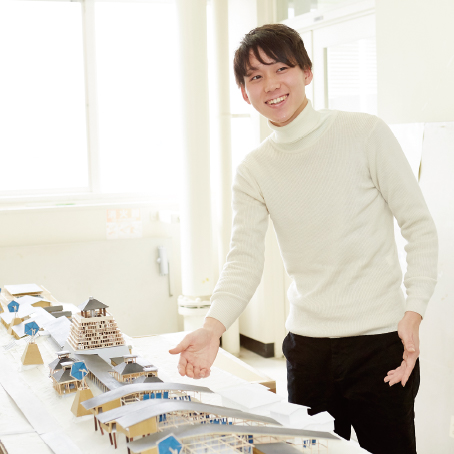 建築物のみに着目するのではなく、建築も人を取り巻く環境の一部として広く捉えるのが環境デザインの視点です。中上さんの卒業設計は、建築の背後にある自然や人の営みに着目し、地域の自然風土や産業をよく調べ、建築にできることを広く考えている点が評価されます。広い視野を身につけ、新しい建築や環境デザインの可能性について考えていきましょう。