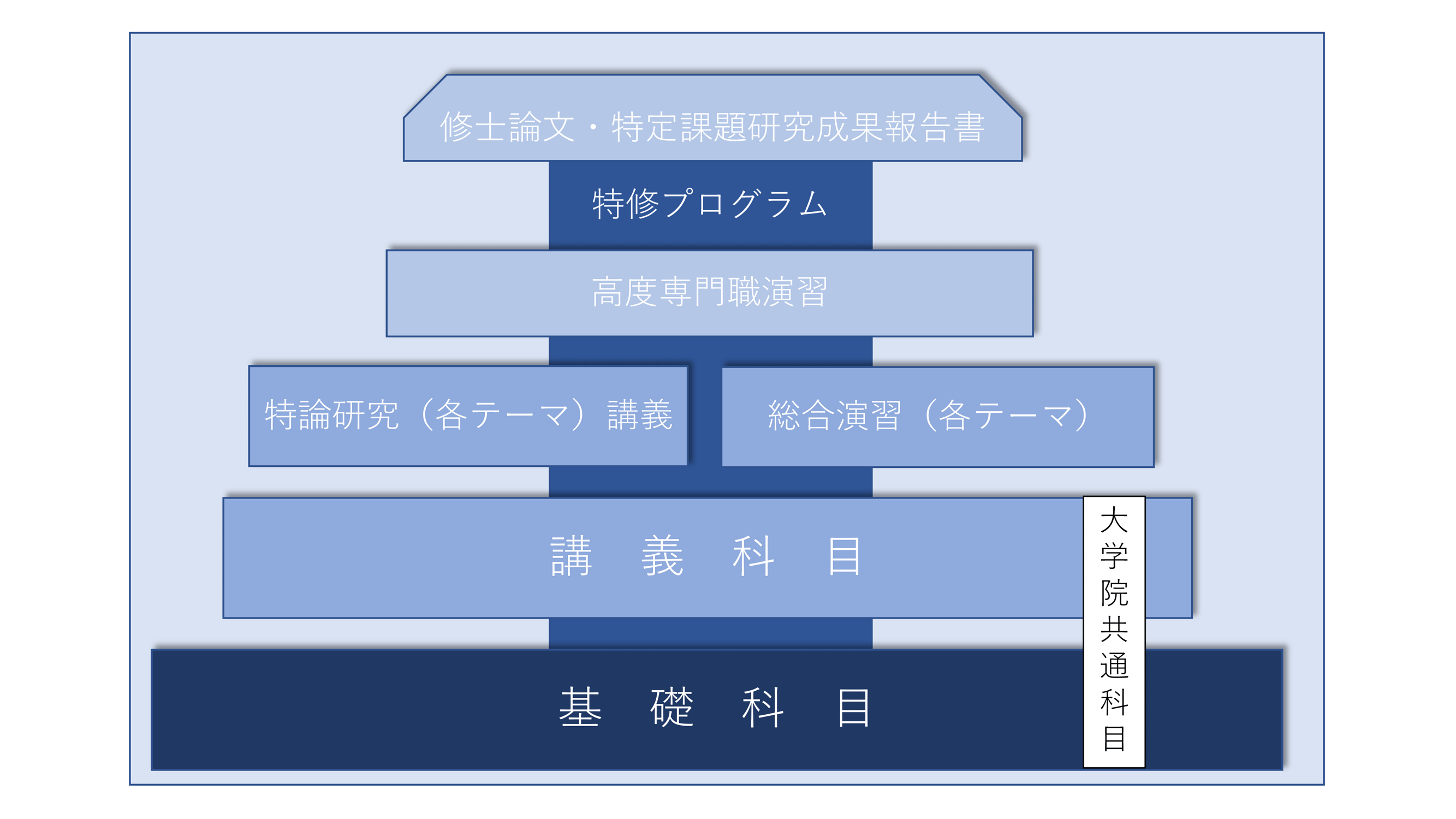 所期の教育効果をあげるため、専門的な職業能力や資格の取得に資する科目を用意しています。 その中には、隣接領域に属する科目や実務的性格の強い科目も含まれており、目的や関心に応じた幅広い履修が可能です。開設科目には基礎科目、演習科目、講義科目の3つのカテゴリーを設け、各カテゴリーにつき、必修または選択必修として、取得すべき単位数を設定しています。これによって、系統的な履修を期待することができます。