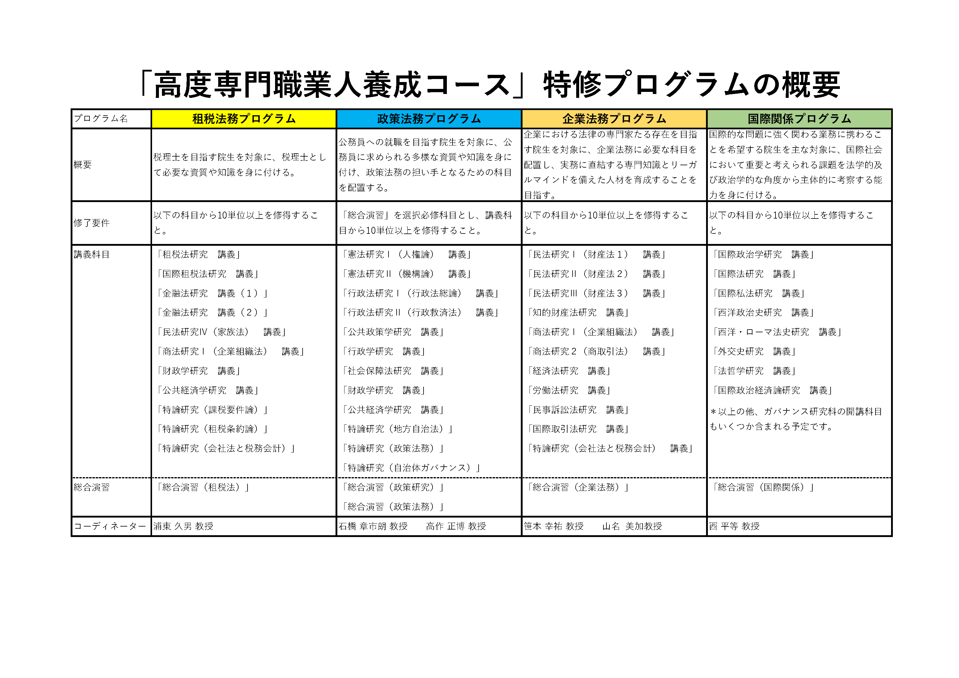 高度専門職業人養成コースの学習・履修指導の一環として、租税法務、政策法務、企業法務、国際関係の4つの特修プログラムを設置しており、それぞれ目指すキャリアに関連性のある科目をパッケージ化しています。