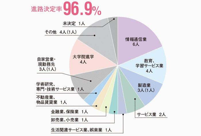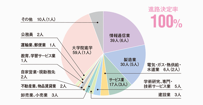 本学科の進路決定率は、学部生・大学院生ともに100%となっています。主な就職先としては情報通信業と製造業となっており、この2業種が学部生では38.3%、大学院生では87.3%を占めています。情報通信業の内訳としては情報サービス業が中心となっており、本学科の特徴をよく表しています。 また、学部生の32.8%(59人)が大学院に進学しており、より深く専門知識や技術を学んだのち、高度な技術者や研究者をめざすことになります。