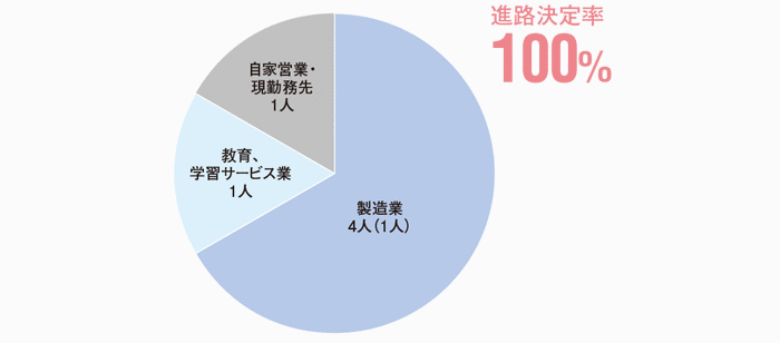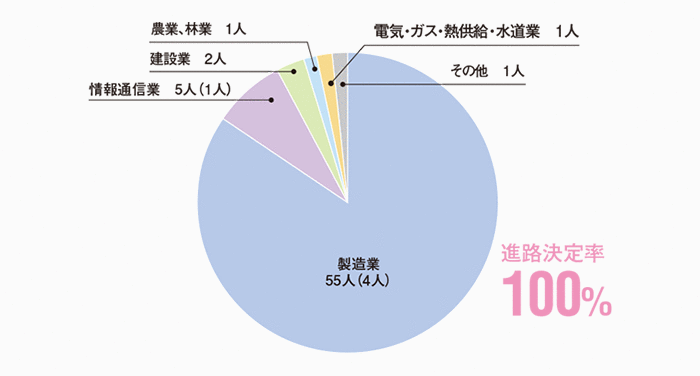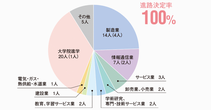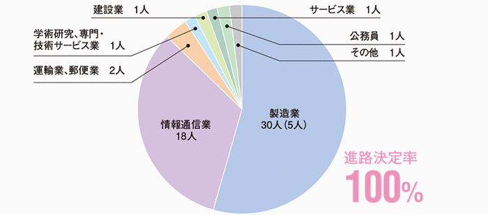 本学科の進路決定率は、学部生・大学院生ともに100%となっています。就職先では製造業が最も多く、次いで情報通信業、卸売業や小売業、教育・学習サービス業など、幅広く分散して就職しています。これは、狭い専門性よりも、基礎を大切にして幅広い応用力を養うという本学科の特徴をよく表しています。また、学部生の35.1%(20人)が大学院に進学しており、より深く専門知識や技術を学んだのち、高度な技術者や研究者をめざすことになります。