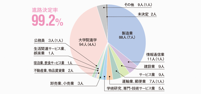 本学科の進路決定率は学部生で99.2%、大学院生で100%となっています。特に製造業への就職率は、理工系3学部の中でも例年高い数値となっています。とりわけ大学院においては製造業への就職率が84%を超えており、特筆に値します。これは「ものづくり日本」において、機械工学を学ぶ学部生や大学院生を求める企業が多いことをよく表しています。また、学部生の38.5%(94人)が大学院に進学しており、より深く専門知識や技術を学んだのち、高度な技術者や研究者をめざすことになります。