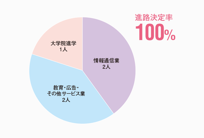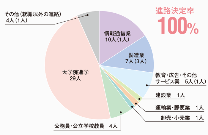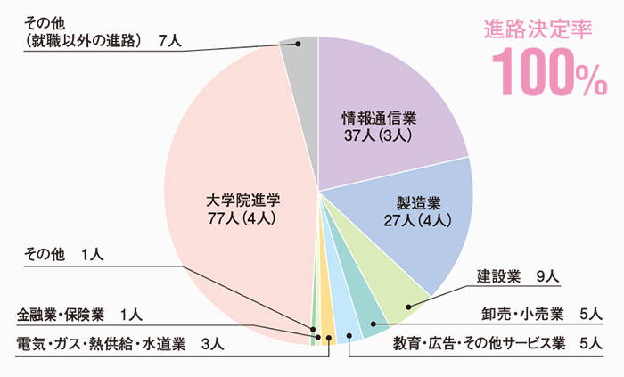 本学科の進路決定率は、学部生・大学院生ともに100%となっています。主な就職先としては情報通信業と製造業となっており、この2業種が学部生では38.3%、大学院生では87.3%を占めています。情報通信業の内訳としては情報サービス業が中心となっており、本学科の特徴をよく表しています。 また、学部生の32.8%(59人)が大学院に進学しており、より深く専門知識や技術を学んだのち、高度な技術者や研究者をめざすことになります。