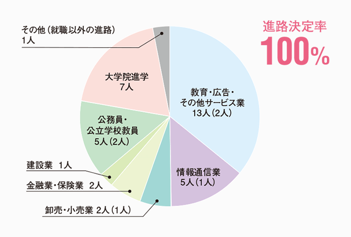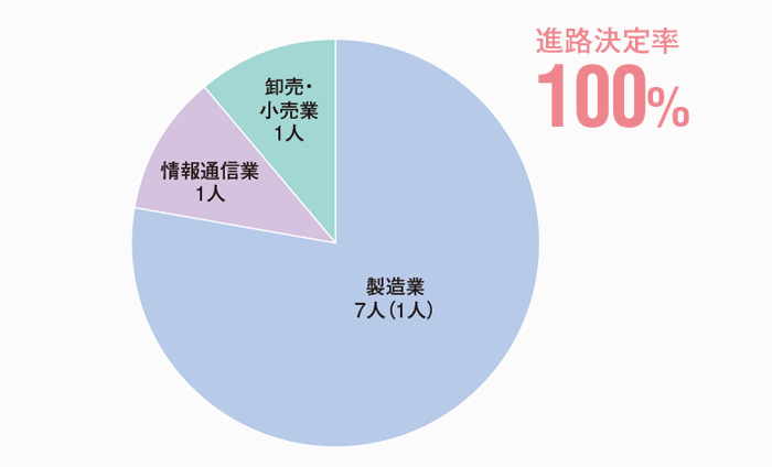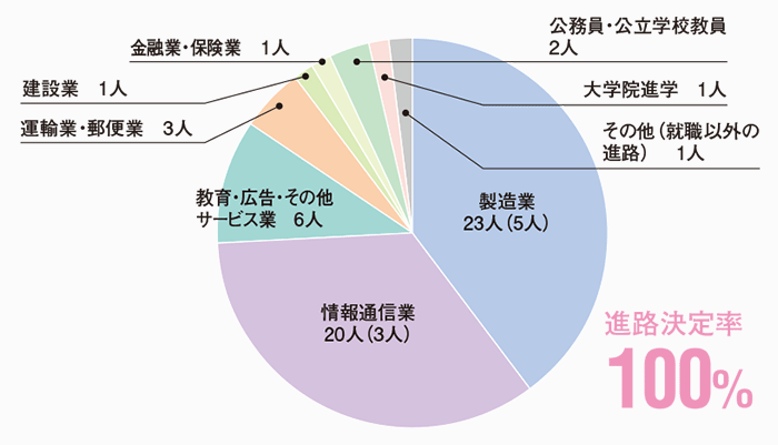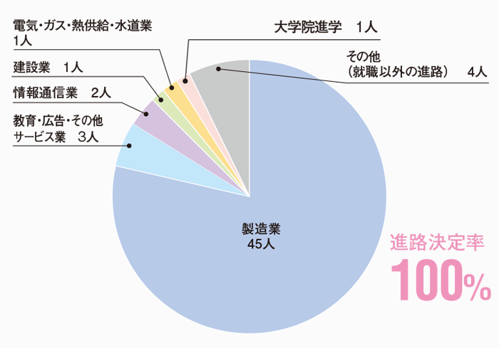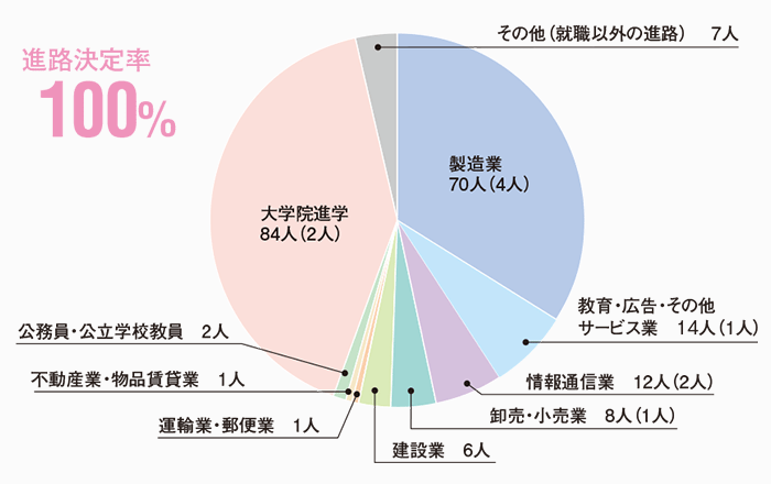 本学科の進路決定率は、学部生・大学院生ともに100%となっています。就職先では製造業が最も多く、次いで情報通信業、卸売業や小売業、教育・学習サービス業など、幅広く分散して就職しています。これは、狭い専門性よりも、基礎を大切にして幅広い応用力を養うという本学科の特徴をよく表しています。また、学部生の35.1%(20人)が大学院に進学しており、より深く専門知識や技術を学んだのち、高度な技術者や研究者をめざすことになります。