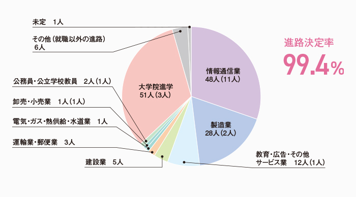 本学科の進路決定率は、学部生で99.4%、大学院生で100%となっています。主な就職先としては情報通信業と製造業となっており、この2業種が就職する者のうち、学部生では76.0%、大学院生では85.6%を占めています。情報通信業の内訳としては情報サービス業が中心となっており、本学科の特徴をよく表しています。 また、学部生の32.3%(51人)が大学院に進学しており、より深く専門知識や技術を学んだのち、高度な技術者や研究者をめざすことになります。