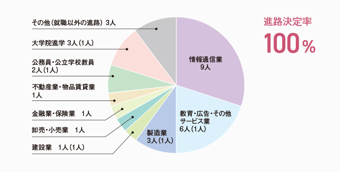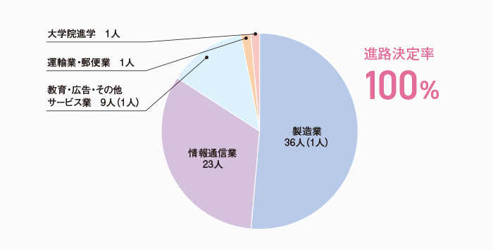 本学科の進路決定率は、学部生・大学院生ともに100%となっています。学部の就職先では情報通信業が最も多く、次いで教育・広告・その他サービス業、製造業など、幅広く分散して就職し、IoT社会の新しい担い手として活躍が期待されています。また、学科で学んだ専門性を活かして、例年教員として採用されています。