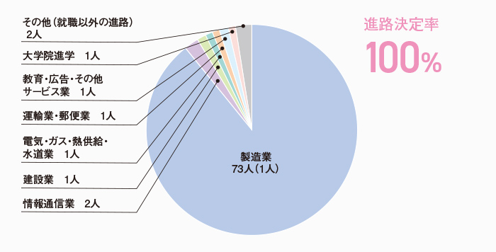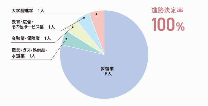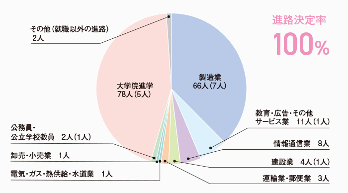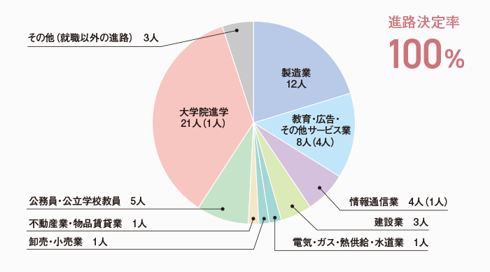 本学科の進路決定率は、学部生・大学院生ともに100%となっています。学部生の就職先では製造業が最も多く、次いで教育・広告・その他サービス業、情報通信業など、幅広く分散して就職しています。これは、狭い専門性よりも、基礎を大切にして幅広い応用力を養うという本学科の特徴をよく表しています。また、学部生の35.6%(21人)が大学院に進学しており、より深く専門知識や技術を学んだのち、高度な技術者や研究者をめざすことになります。