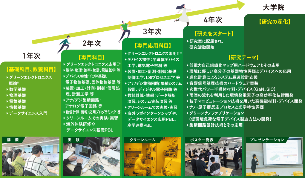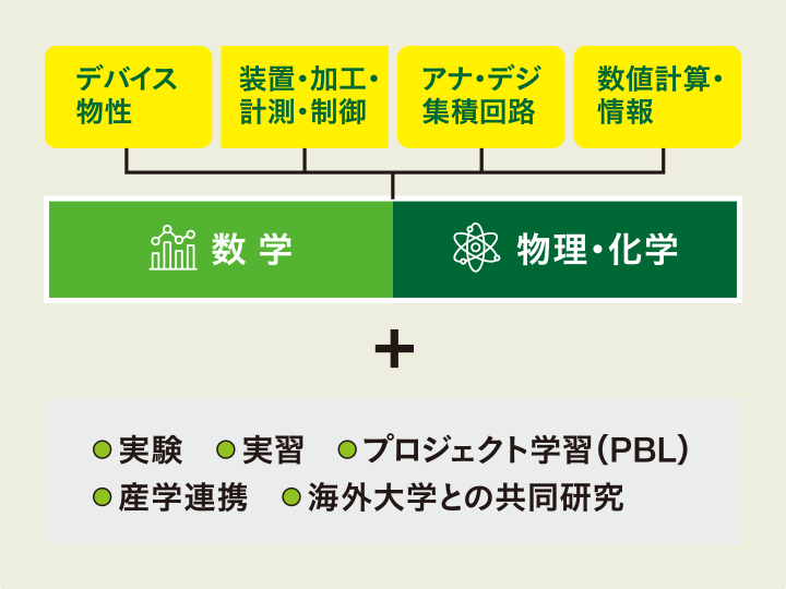 電気・電子工学の原理に低電力化を目指すグリーン化技術を加えるとともに、材料科学、化学、環境科学、データサイエンスの知識を組み合わせ、総合的・学際的な観点から課題に取り組むことができます。