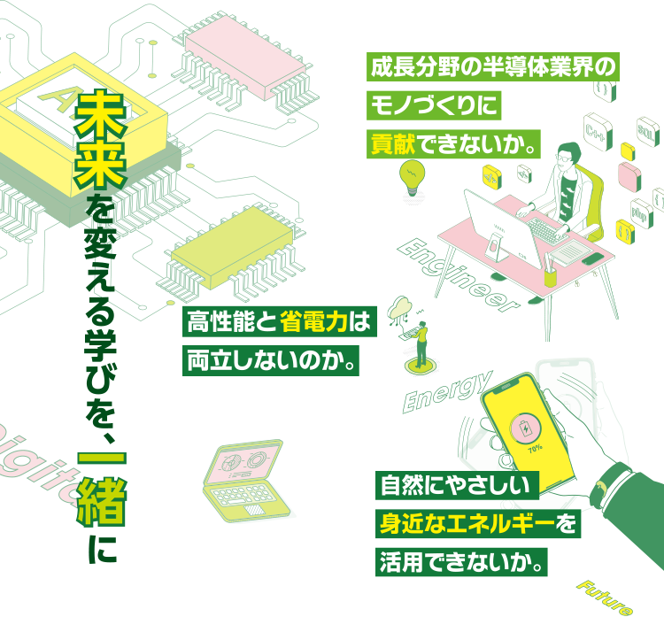 デジタル化が進む現代における課題は私たちが日常的に利用する電子機器やソフトウェアに使われる「半導体」を地球に優しい形で進化させることで未来を変え、解決することができます。