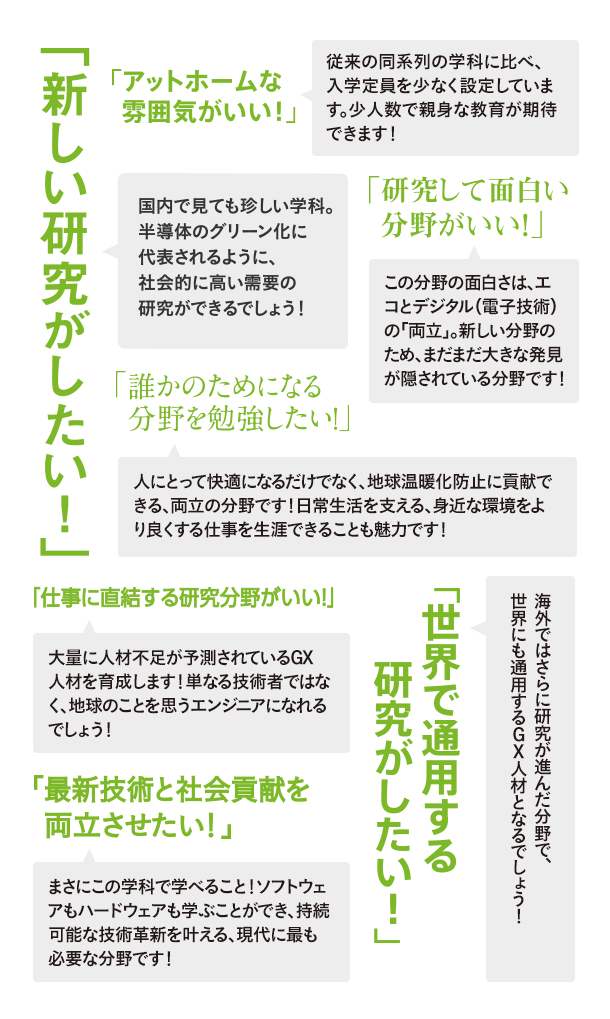 デジタル化が進む現代に、その根幹を支えるエレクトロニクス(電子工学)をグリーンにデザインする、グリーンエレクトロニクス工学科を日本で初めて開設します。世界的にも注目度が高く、大量の人材不足が予測されている、新たなグリーンテクノロジーを開発するGX(グリーントランスフォーメーション)人材を育成します。スマホやパソコン、EV車などに搭載の半導体デバイスを中心に、ハードウェアとソフトウェアの両面から、資源循環を意識した原料、電力消費量の少ない集積回路設計、その回路を用いたエネルギー効率の高いAIアルゴリズムの開発を研究します。