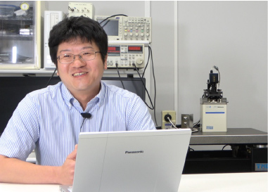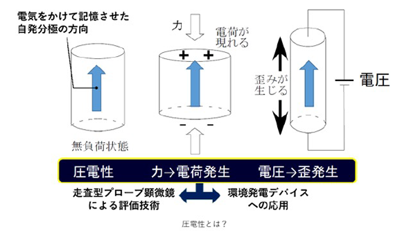 強誘電性高分子は電気をかけた方向を記憶できる特殊なプラスチックで、プラスチック内部の分子が電気をかけ終わった後もかけた方向に整列したままであるために、物質内で自発分極と呼ばれる電気の偏りが生じます。この特殊なプラスチックは外部から力を加えると電荷(正と負の電気)が現れたり、弱い電圧を加えると歪(ひずみ)が生じたりします。このような性質は圧電性と呼ばれており、この性質を活かして環境発電(エナジーハーべスティング)デバイスへの応用が期待されています。宝田先生は、この圧電性を評価するために、走査型プローブ顕微鏡を用いた新しい技術を開発しています。