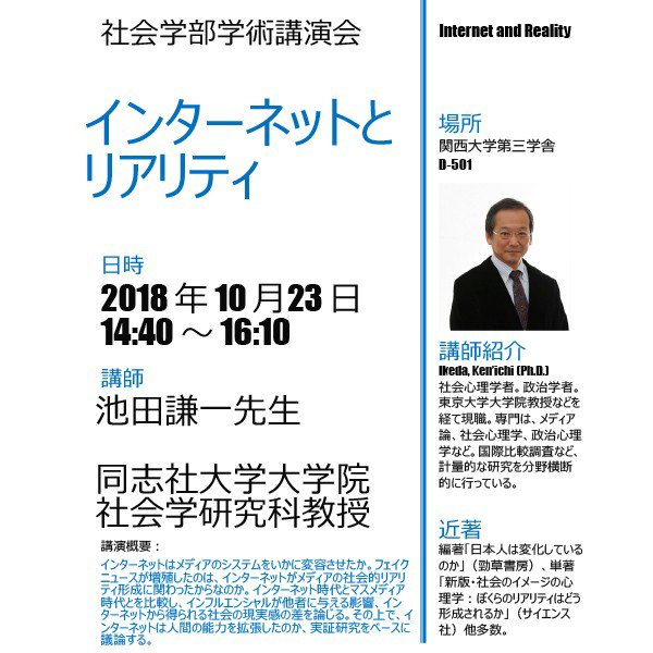 社会学部では、池田謙一氏をお招きし、下記のとおり学術講演会を開催します。