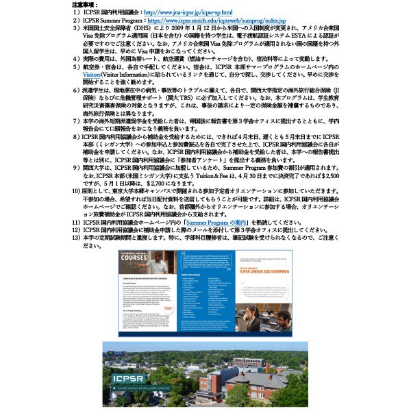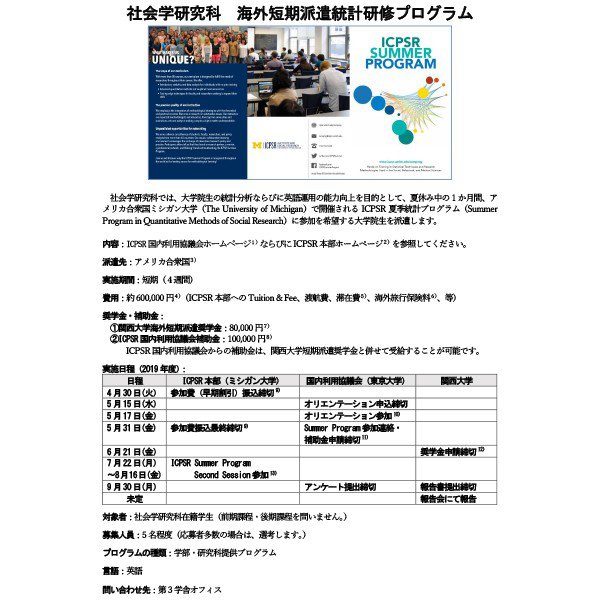 これは、米国ミシガン大学にあるInter-university Consortium for Political and Social Researchesが毎夏実施しているICPSR Summer Programという社会調査データ統計分析夏季集中セミナーに参加を希望する本学社会学研究科(博士課程前期課程・後期課程)大学院生に対して、関西大学国際部から短期派遣奨学金8万円、学外団体であるICPSR国内利用協議会から補助金10万円、合計18万円(返済不要)を給付して1ヶ月間、統計ならびに英語の研修を受けて来てもらう、という制度です。