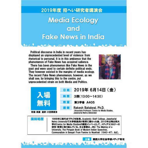 社会学部では、バタビタル ラケシュ 氏をお招きし、下記のとおり招へい研究員講義を開催します。
