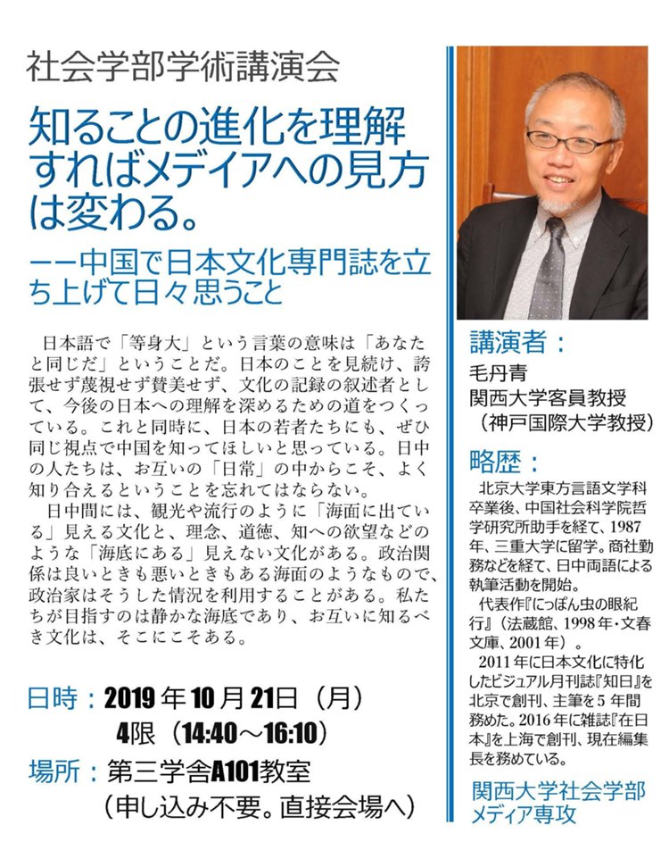 社会学部では、毛丹青 氏をお招きし、客員教授講演会を以下のとおり開催いたします。