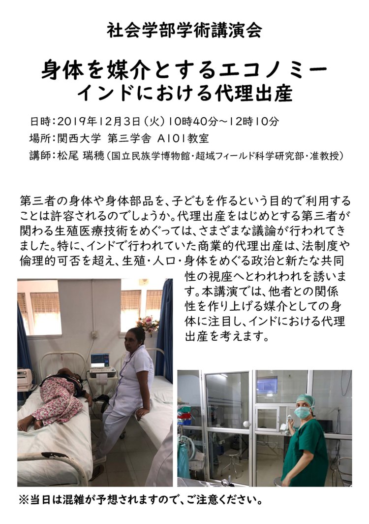 性の視座へとわれわれを誘います。本講演では、他者との関係性を作り上げる媒介としての身体に注目し、インドにおける代理出産を考えます。