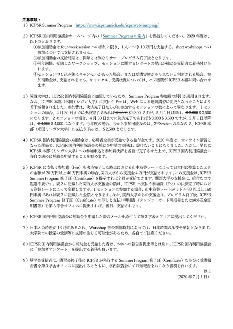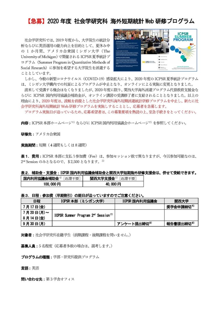 渡米して受講する機会はなくなりましたが、2020年度に限り、関西大学海外派遣プログラム代替教育支援金ならびにICPSR国内利用協議会補助金が、オンライン講習の受講修了者に支給されることとなりました。以上の理由により、2020年度は、渡航を前提とした社会学研究科海外短期派遣統計研修プログラムを中止し、新たに社会学研究科海外短期統計Web研修プログラムを実施しすることとし、応募者を急募します。