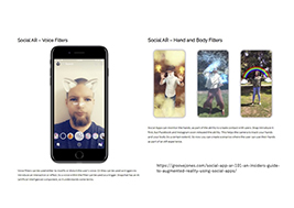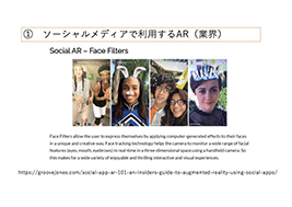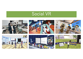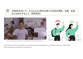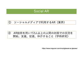 例えばSocial AR は Facebook、Instagram などのソーシャルアプリでカメラフィルターとして利用される ARを指すが、より広範にはデジタル情報によって増強された2人以上の人々のインタラクティブな社会体験をSocial ARとされ研究が進められている。またGoogle と Facebookは2018 年にSocial VRというコンセプトを打ち出している。Social VR はVRChatやcluster などのプラットフォームを指し、そこで VR ゴーグルを利用するSocial VRの利用者への影響を調べるための実験や調査も進められている。