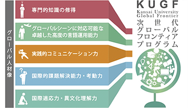 本学の学生が“次世代グローバルリーダー”として国際社会の各分野で活躍できる力の醸成を目指し、2014年度に「KUGF(Kansai University Global Frontier)プログラム」及び「国際協力サービスラーニングプログラム」を開設しました。 KUGFプログラムでは、「英語で」学ぶKUGF科目を開講し、2014年度から2016年度まで開講科目数は42科目、72科目、82科目、履修者数は642名、1,577名、2,227名と飛躍的に数字を伸ばしました。現在は以下の8つの専門分野科目のモジュールからなる「グローバル・フロンティア科目」「留学準備スキルアップ科目」及び「日本語スキルアップ科目」によって構成されています。