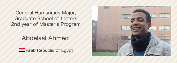 I would like to first proceed to the Doctoral Program and acquire a Ph. D. After I earn my doctorate, I hope to return to my homeland and be able to contribute to my homeland. There are no Japanese guides in Egypt who have a doctorate in archaeology. I hope to become a professor at a university, and teach students about tourism studies, including studies in archaeology and Japanese language, and thus enhance the quality of tourism guides in Egypt. Also, I am currently able to live this life thanks to the support I receive from a variety of people, and so when I graduate, I would like to repay even just a little of the kindness that I am receiving now by serving as a bridge between Egypt and Japan.