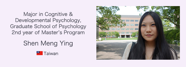 I became interested in Japan because of music and anime. When I was in junior high school, I happened to hear the music of the Japanese band B'z, and I started studying Japanese because I wanted to know what they were singing about. I majored in Japanese language at a university in Taiwan, but after advancing to graduate school, I started thinking that it would be wasteful to major just in the Japanese language. I had always had an interest in psychology, and so, I decided to study at a graduate school in Japan, because that way, I would be able to learn real Japanese that is used by the people, while also being able to study a specialized major.
