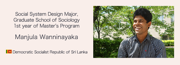 I am studying management at the Graduate School of Sociology. I am taking a broad range of classes related to economics, commerce, sociology and business administration. In the world of business, the Japanese-style system is outstanding, and there is much to learn from it. For example, the Toyota Production System, such as kaizen and kanban, is implemented widely by companies in Sri Lanka. There are also many things that can be learned from Japanese companies, such as their detailed attention toward clients and their business management from the perspective of the customers. Sri Lanka today is said to be similar to what Japan was like before its post-war rapid economic growth. I am planning to do my master's thesis on whether we could bring economic growth in my home country by implementing the Japanese-style system, especially by actively incorporating collective behavior.