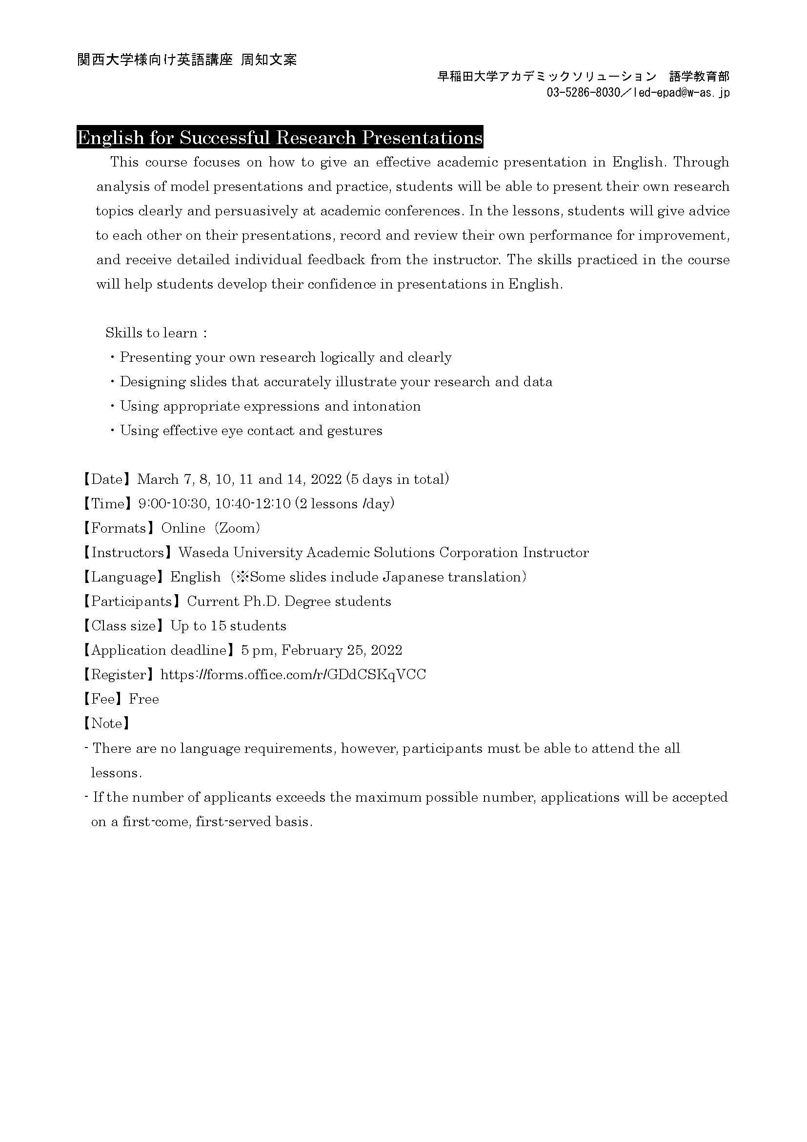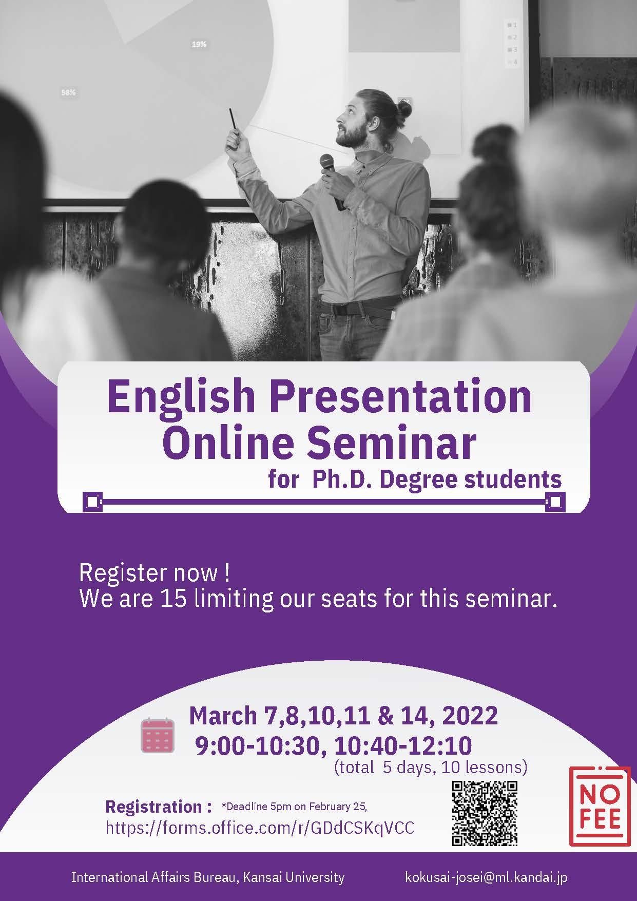 We will hold online English presentation seminar for Ph.D. Degree students who plan to present their research at international conferences and interact with overseas researchers, as stated below.