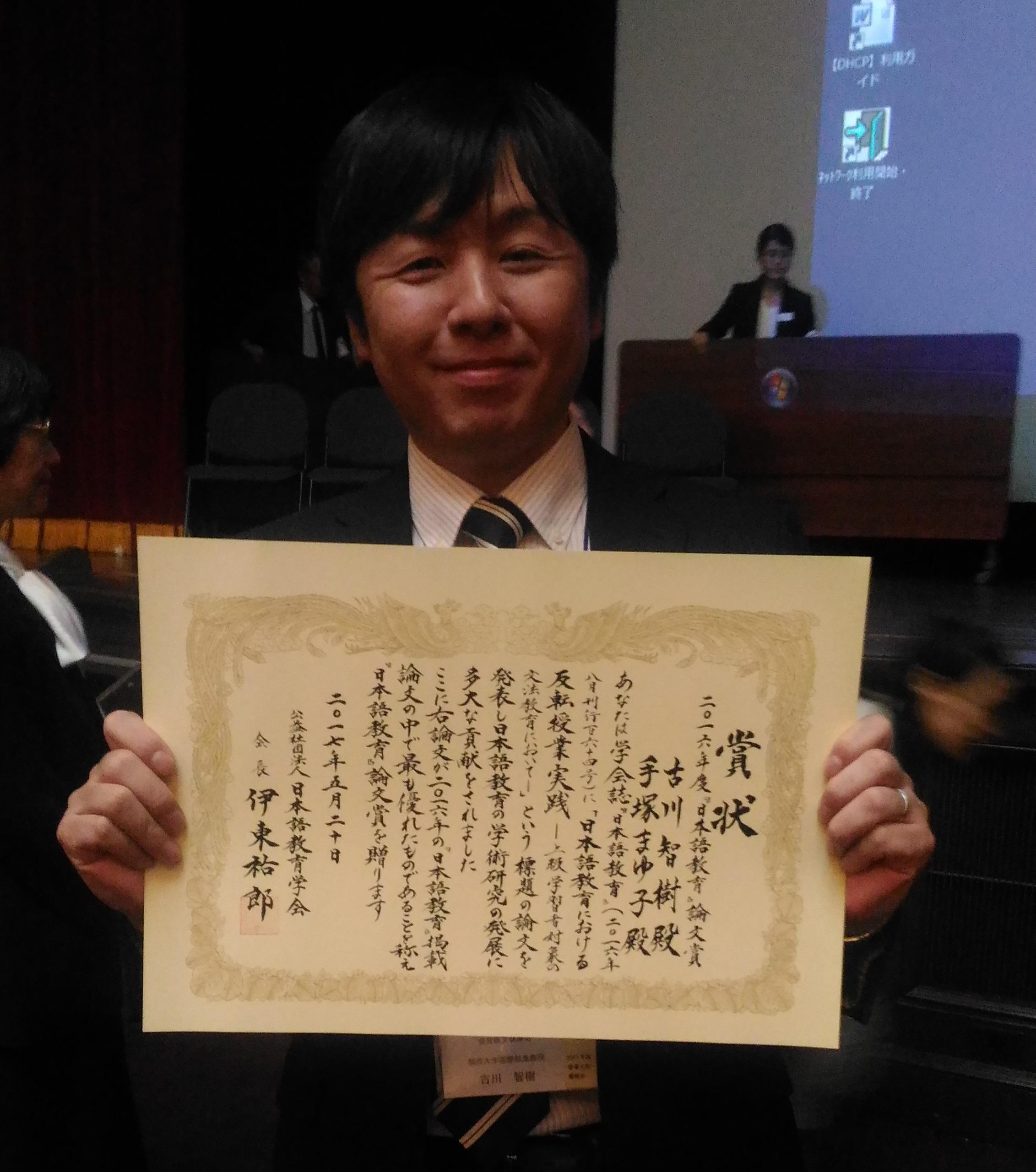 Associate Professor Tomoki Furukawa from Division of International Affairs and Mayuko Tezuka from Japanese Language and Culture Program were awarded the prize the best "Japanese Language Education" paper award of 2016 at the "Spring Meeting of the Japanese Language Education Association for 2017" was held at Waseda University on May 20th and 21st.