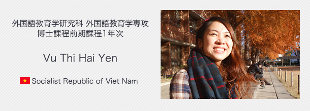 日本における外国語教育の指導法や勉強法について学んでいます。日本の教育の現状と課題が解りとても興味深いです。また、言語そのものにも興味があるので、学部生に混ざって英語・中国語・韓国語の授業も聴講しています。修士論文では、ベトナムにおける日本語教育、特に漢字教育について研究する予定です。ベトナムでは中学校・高校で中国の漢語を学んでいます。漢語を有効活用してベトナム人がもっと効果的に日本語を学べる方法を探りたいと思っています。