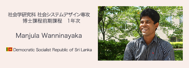 社会学研究科にてマネジメントを中心に学んでいます。経済・商学・社会学と経営に関連する授業を幅広く履修しています。ビジネスの世界では日本式のシステムは優れており、学ぶべき点が多くあります。例えば、カイゼンやカンバンなど、トヨタ生産方式はスリランカ企業でも広く導入されています。また、日本企業の顧客へのきめ細やかな対応やお客様目線での経営など、学ぶべき点は多いです。今のスリランカは、戦後の高度経済成長に入る前の日本と似ているといわれています。これから大きく成長するであろう母国において、日本式システム、特に集団的行動を積極的に取り入れることで経済成長へ繋げられないか、これから修士論文で研究していく予定です。