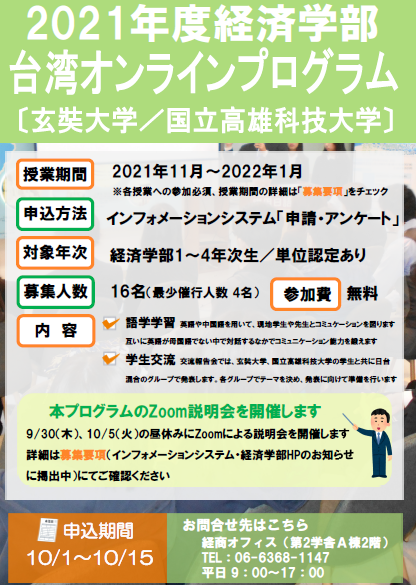 【経済学部】2021年度台湾オンラインプログラム募集要項を公開しました