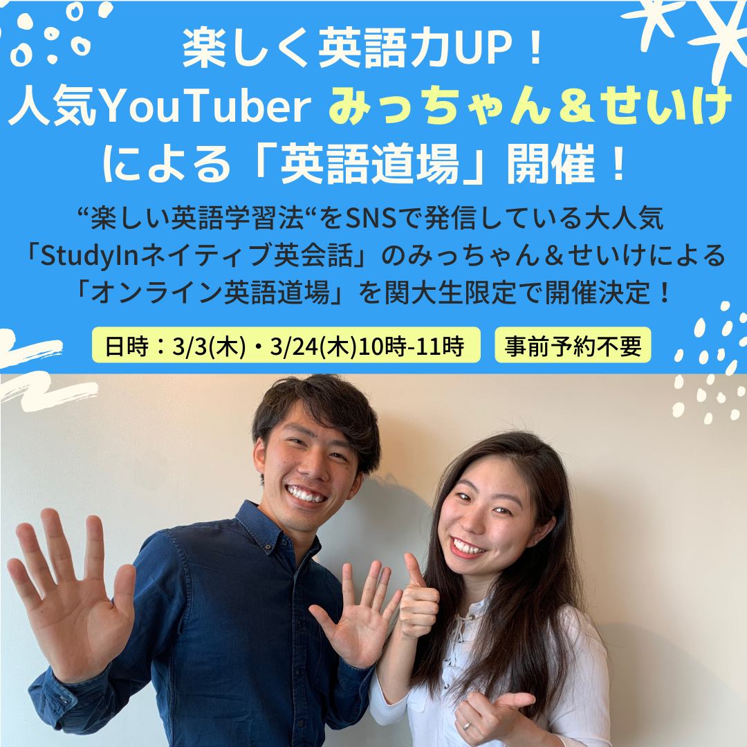 “楽しい英語学習法“を日々SNSで発信している大人気「StudyInネイティブ英会話」のみっちゃん&せいけによる「オンライン英語道場」を関大生限定で2日間にわたって開催決定!