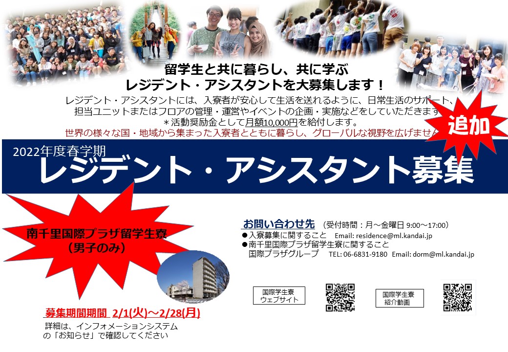 ★追加募集!★ ◆国際学生寮で国際交流しませんか?◆2022年度春学期 レジデント・アシスタント追加募集