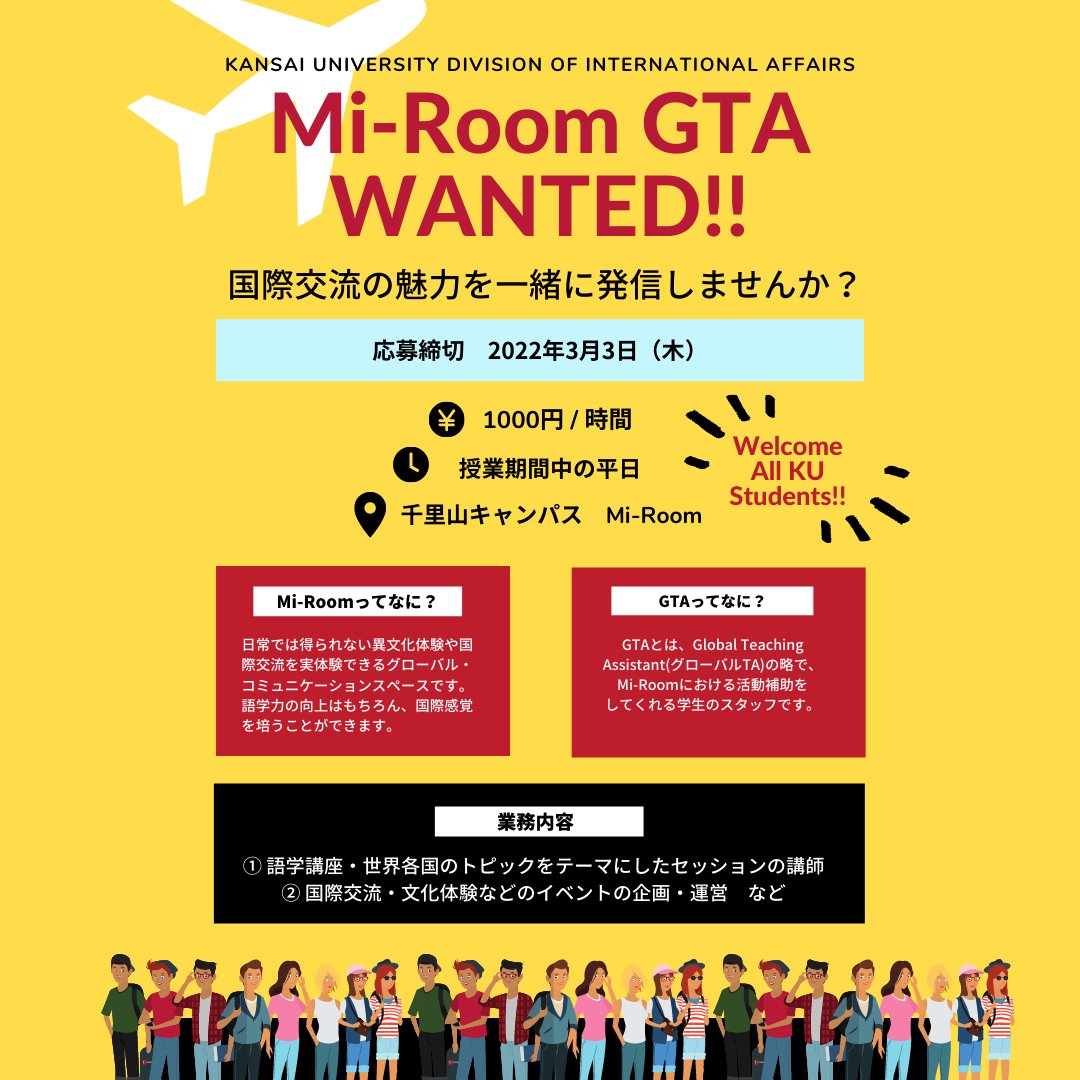 【Mi-Room】国際部学生スタッフGTA(Global Teaching Assistant)募集ー国際交流の魅力を一緒に発信しませんか?ー