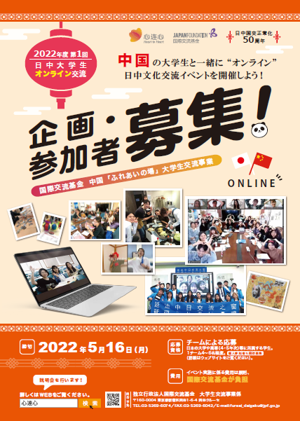 独立行政法人国際交流基金より、中国「ふれあいの場」大学生交流事業の案内がありました。