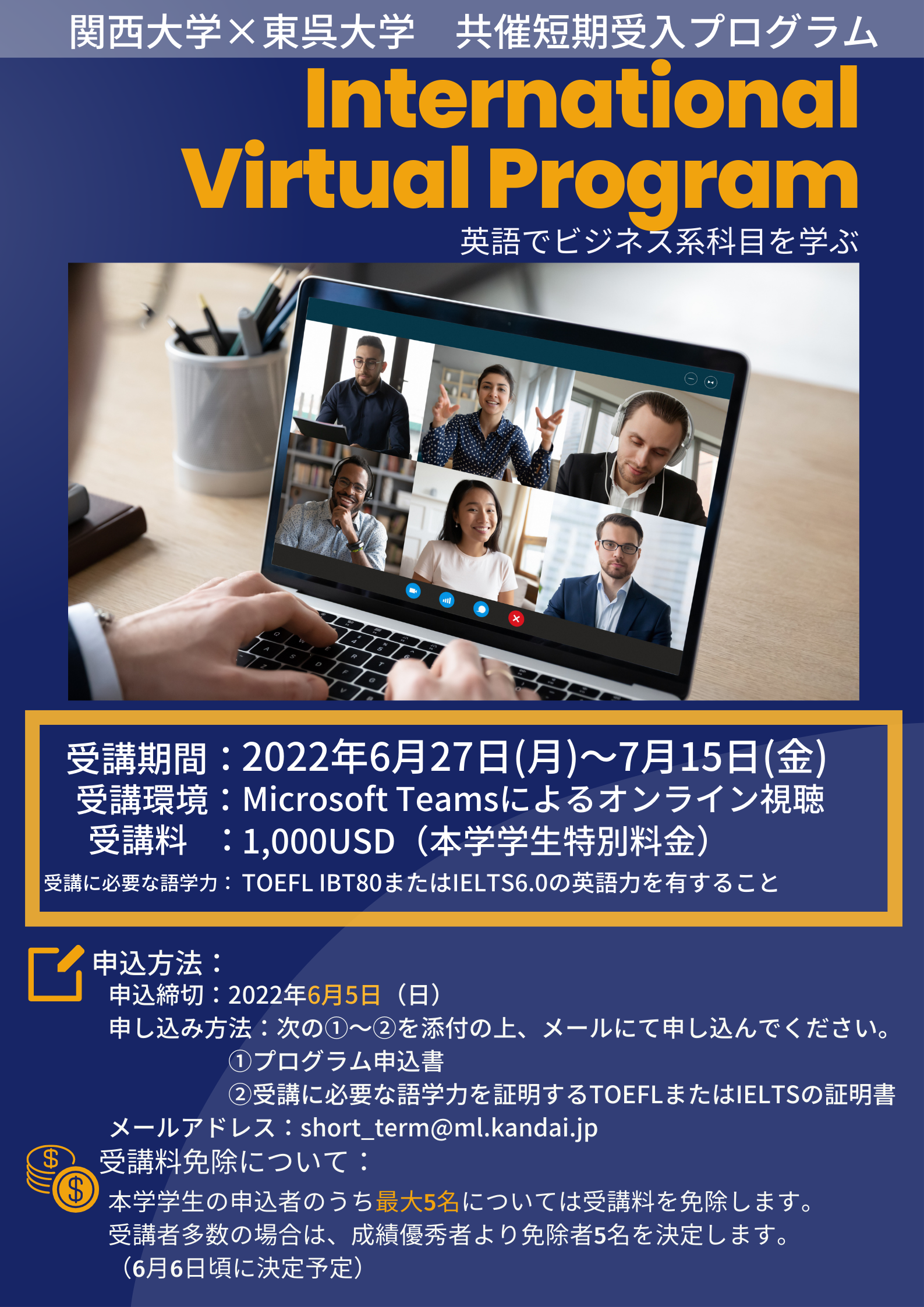 【受講料】1,000USD(本学学生特別料金)*受講料免除あり