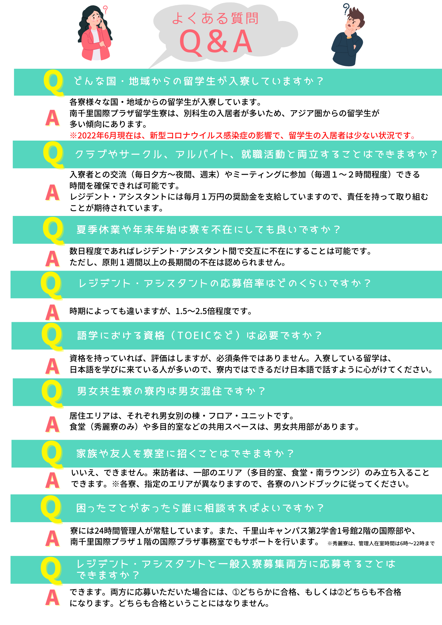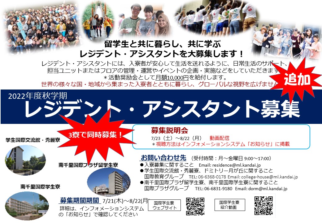 「学生国際交流館・秀麗寮」・「南千里国際プラザ留学生寮」・「南千里国際学生寮」では、入寮者が安心して生活を送れるように日常生活をサポートする「レジデント・アシスタント」を募集します!