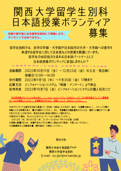 ※2022年度秋学期のボランティアは、対面で、南千里にある留学生別科にて実施します。