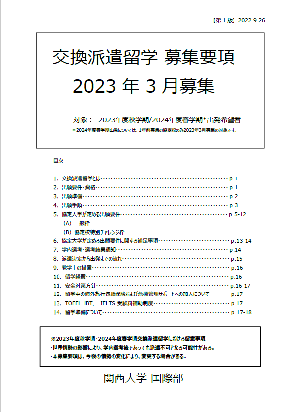 【2023 年秋学期/2024年春学期交換派遣留学における留意事項(「募集要項」表紙)参照】
