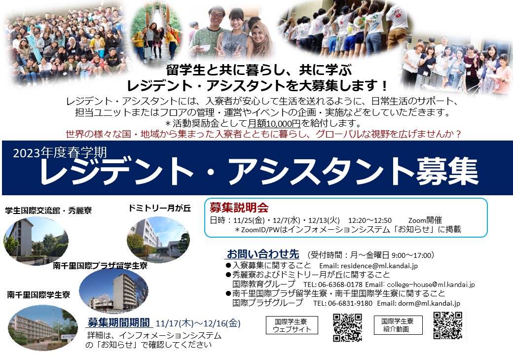 「学生国際交流館・秀麗寮」・「ドミトリー月が丘」・「南千里国際プラザ留学生寮」・「南千里国際学生寮」では、入寮者が安心して生活を送れるように日常生活をサポートする「レジデント・アシスタント」を募集します!