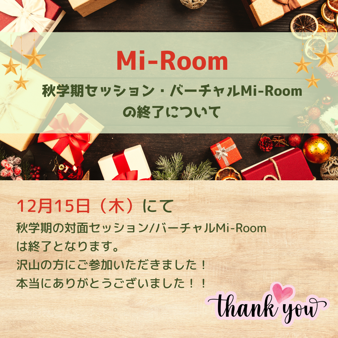 早いもので12月15日(木)をもって、秋学期のMi-RoomセッションとVirtual Mi-Roomの開室をすべて終了とさせていただきます。