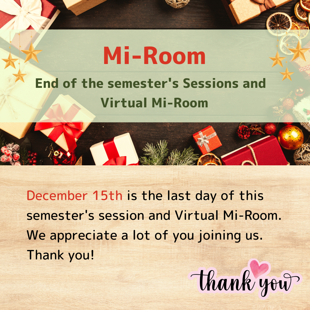 As of December 15 (Thursday), all Mi-Room sessions and Virtual Mi-Room will be closed for the fall semester.