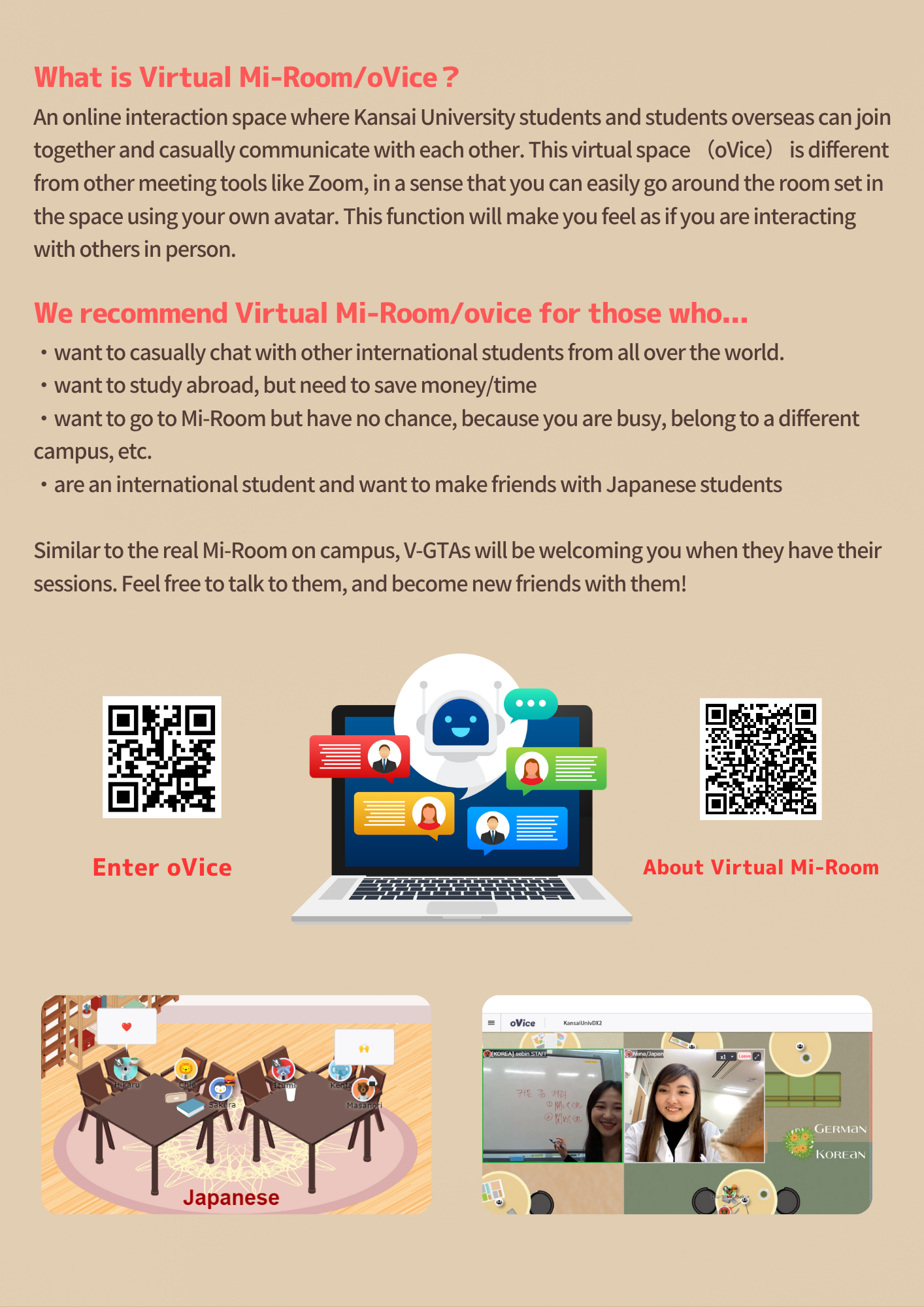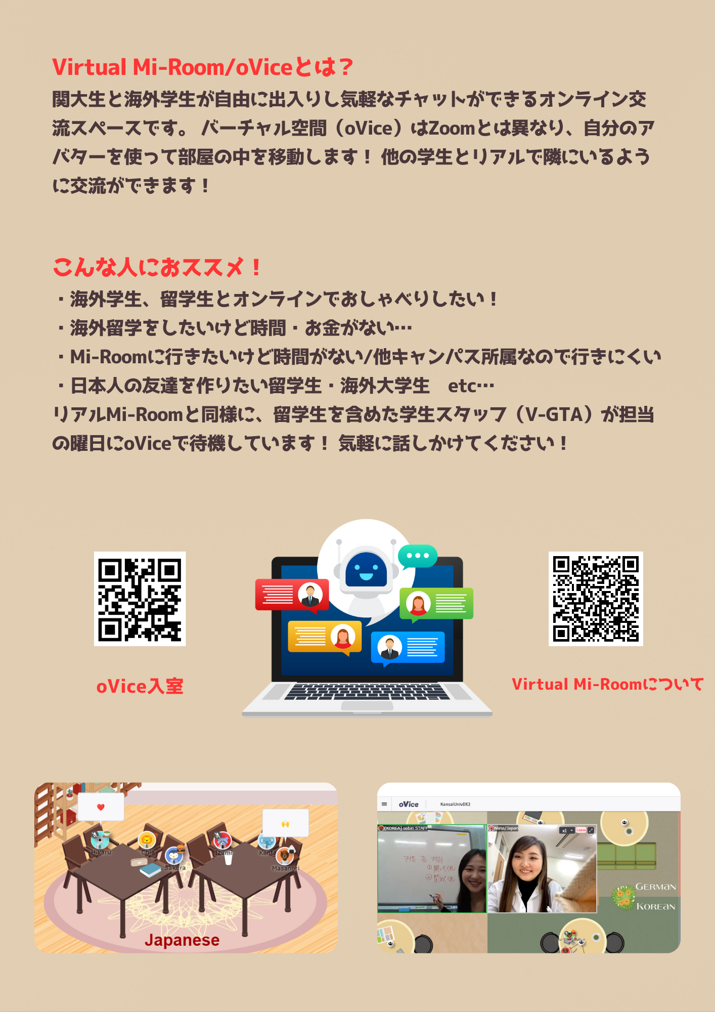 『バーチャル エムアイルーム (Virtual Multilingual Immersion Room)』とは、関大生&世界各国の本学協定校の学生が自由に会話できるオンライン空間です。メタバースツール「oVice」を使ったオンラインのスキマ留学を体験することができます。
