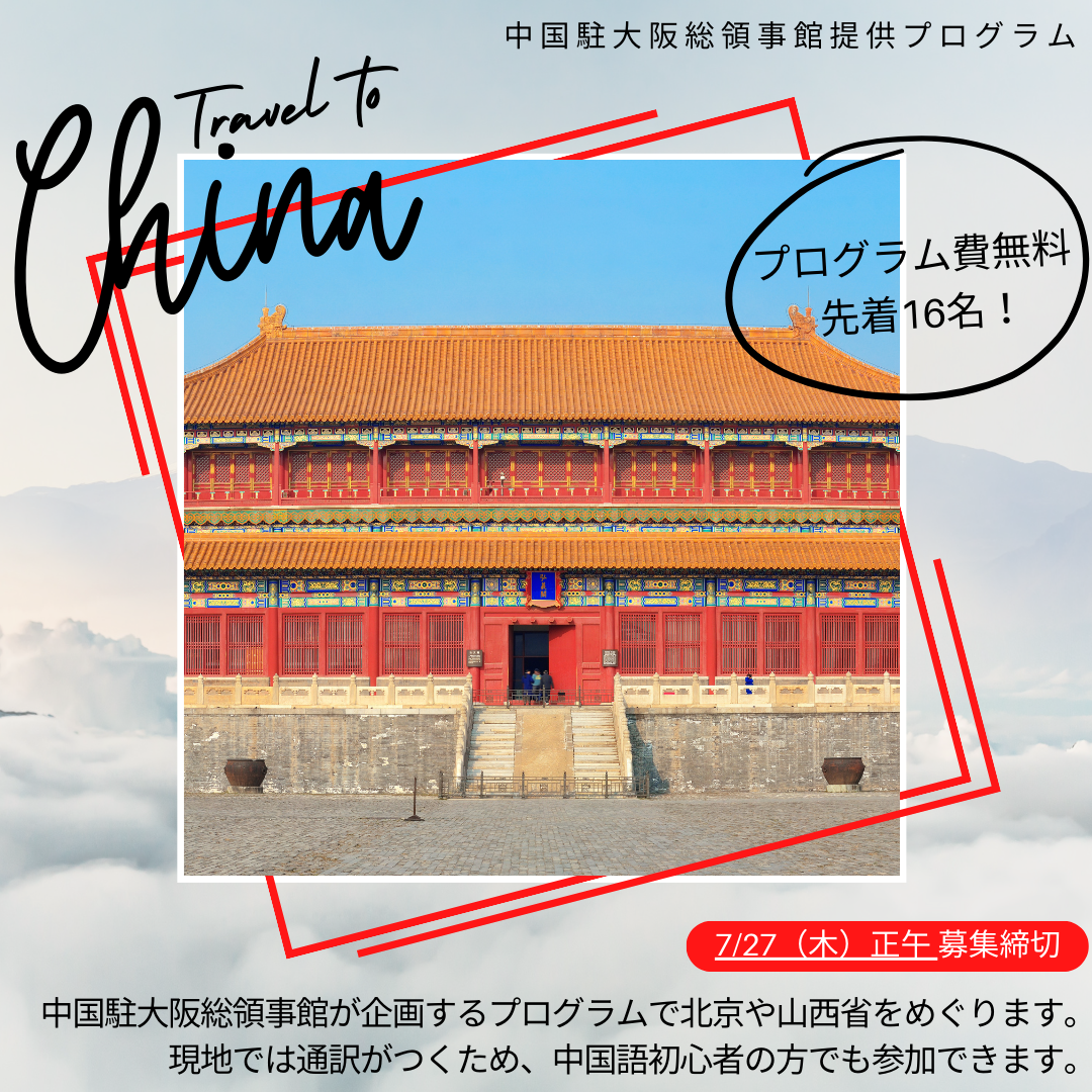 中国駐大阪総領事館から、9月に実施される7泊8日の中国・北京・山西ツアー【中日友好大学生訪中団プログラム】のご案内がありました。
